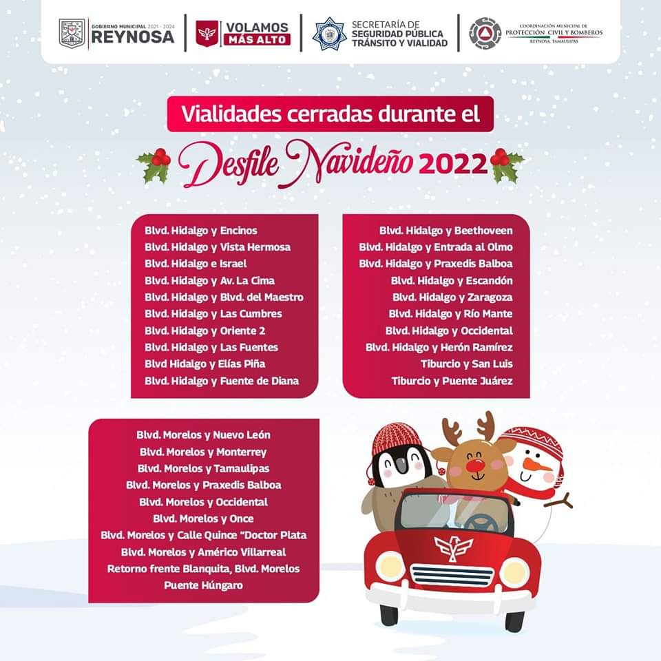 Así mismo el Gobierno de Reynosa recomienda a aquellas personas que utilizan las avenidas por las que pasará el Desfile, prevengan su recorrido para evitarse contratiempos y tomen vías alternas, ya que se harán cierres parciales en la circulación vehicular durante el paso de la caravana navideña.