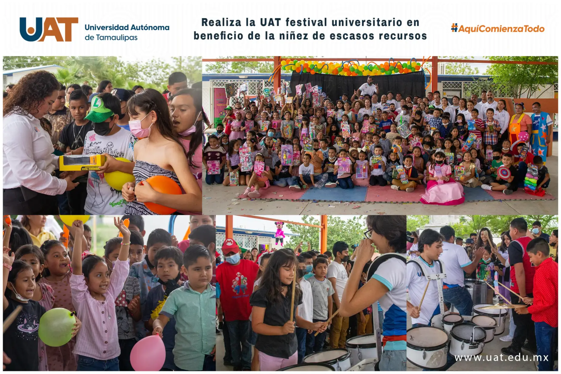 En el marco de la celebración de este 30 de abril día del niño y la niña, la Universidad Autónoma de Tamaulipas (UAT) llevó a cabo el Festival Infantil Universitario, donde estudiantes y trabajadores de la institución hicieron entrega de juguetes y llevaron momentos de recreación y esparcimiento en la Primaria “Dr. Rodolfo Torre Cantú” ubicada en la colonia Marte. R. Gómez de Cd. Victoria.